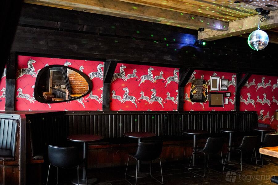Adorned with striking red zebra wallpaper and trendy decor, this visually captivating backdrop sets the stage for an unforgettable night.