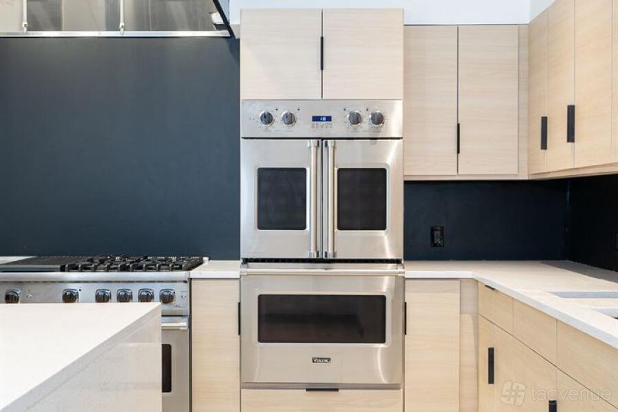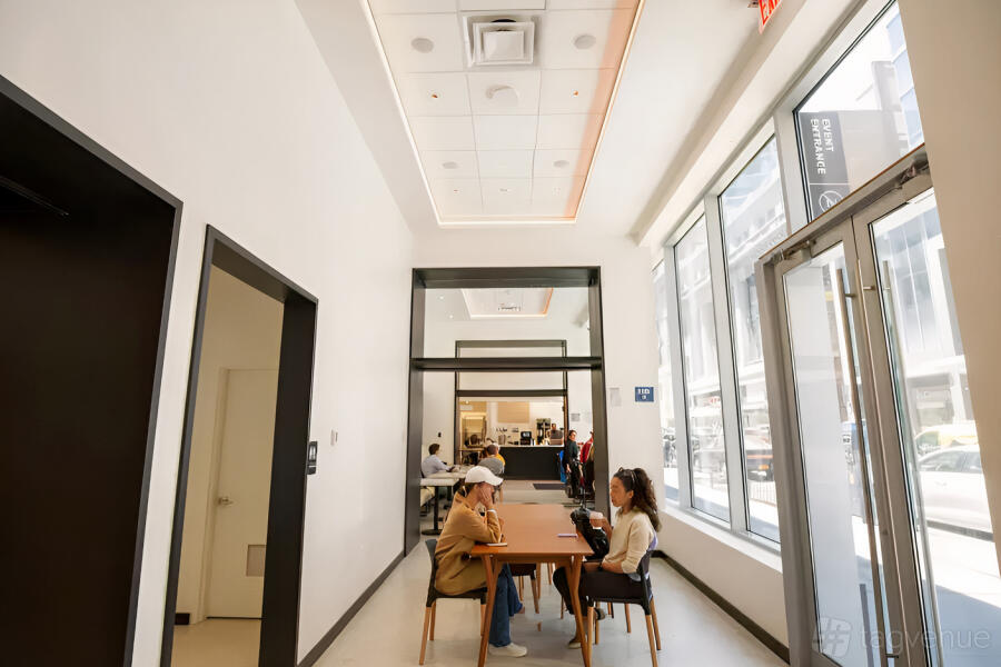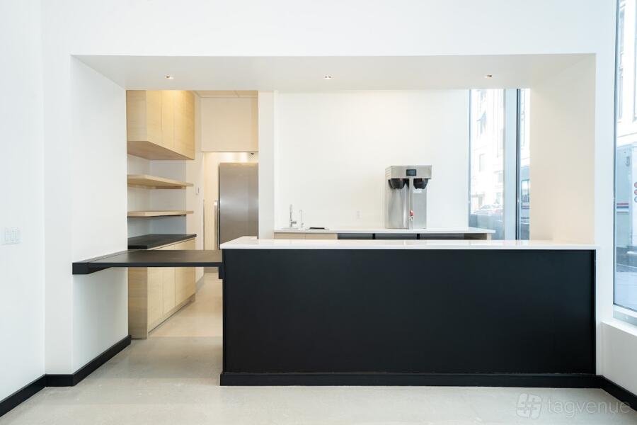 Our event space is bathed in natural light, featuring impressive 18-foot ceilings adorned with full-height windows. Inside, you'll find modern banquette seating, stylish countertops, comfortable lounge areas, and a state-of-the-art show kitchen fully equipped with top-of-the-line Viking equipment.