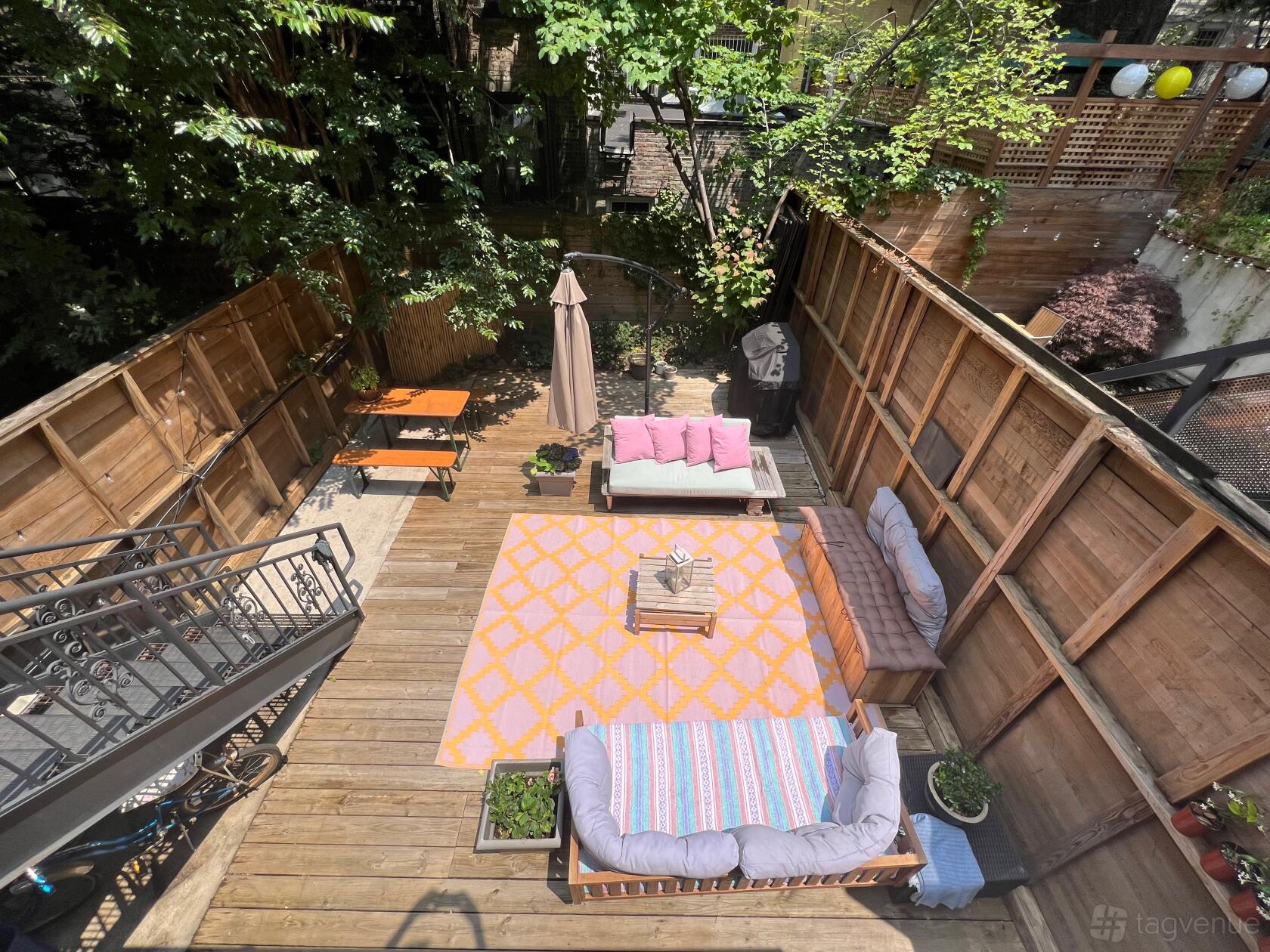 Take advantage of our delightful patio, thoughtfully included in your rental. Spanning 250 sq feet, this hardwood patio seamlessly extends your shoots and events into the great outdoors. Connected by a staircase, a 600 sq foot garden space is available at an additional cost. During the spring and summer, this garden transforms into a tranquil oasis, nestled on a tree-lined Midtown block that evokes the charm of Brooklyn more than bustling Manhattan.