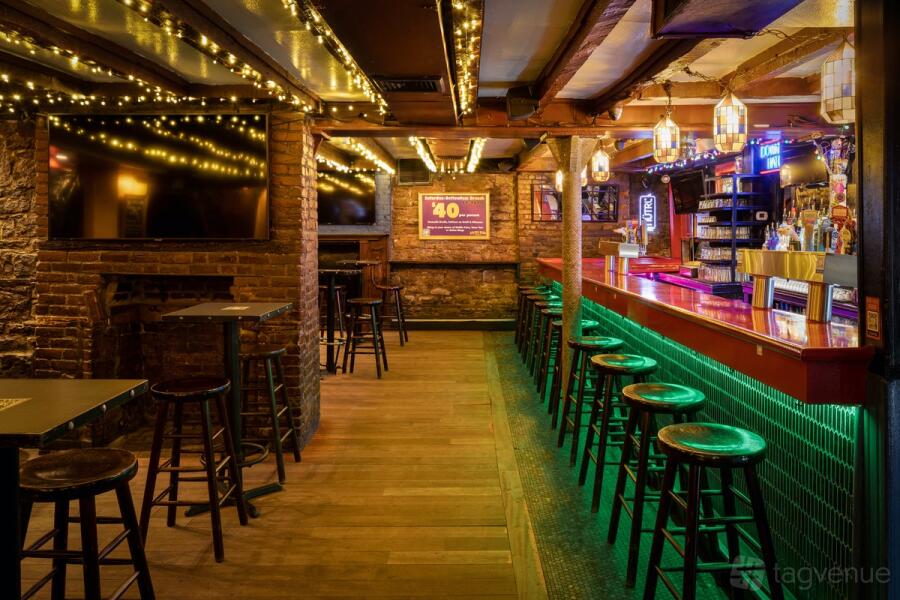 Introducing the Backroom at The Hatch, a stylish and inviting space that can accommodate up to 40 people. This semi-private area is separated by a velvet rope, offering a laid-back atmosphere for various occasions. With high-top tables, exposed brick walls, and glimmering ceiling lights, this party space is perfect for group gatherings, happy hours, or birthday parties.