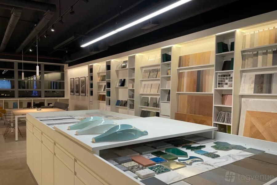 The conference room is a 300-square-foot space, uniquely situated within a gallery, offering a distinctive and aesthetically pleasing environment. It is enclosed by glass, creating an atmosphere that is both private and visually connected to the surrounding gallery.