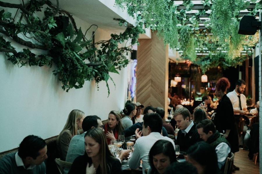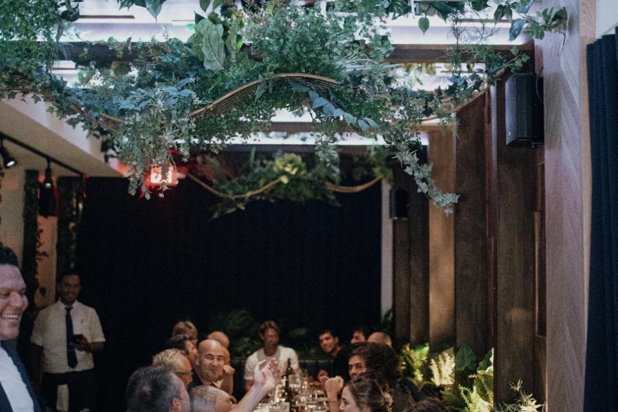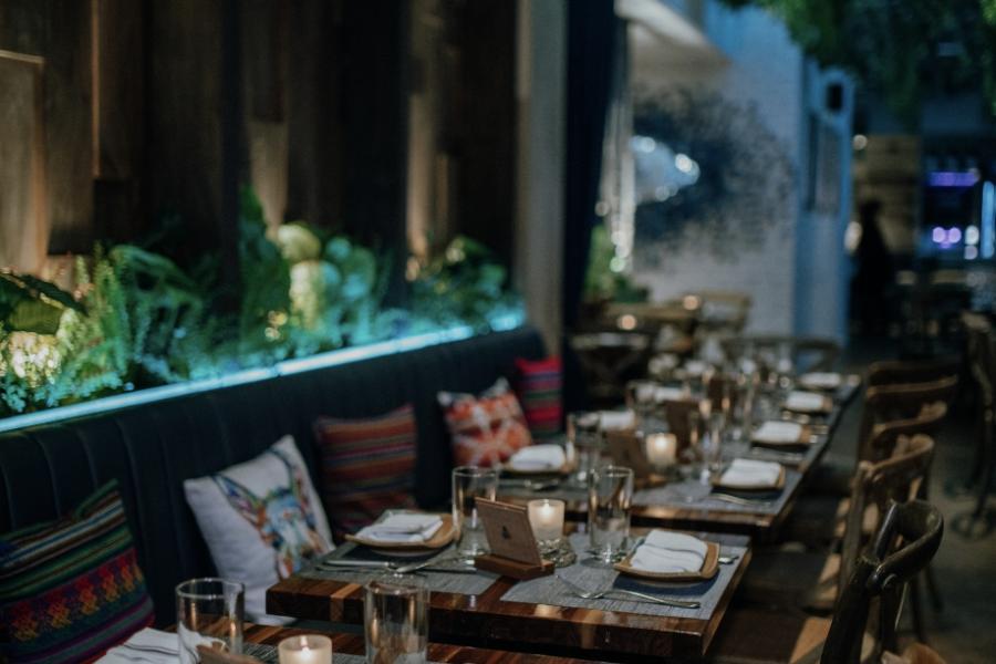Relaxing, refreshing, and rustic, our dining room is an ode to the Peruvian culture and its lush green landscape. Traditional macrame tapestries, bright color splashes, plant-decorated walls, an indoor plant ceiling, comfortable table seating, an open bar, and ambient lighting complete the scene for your event.
