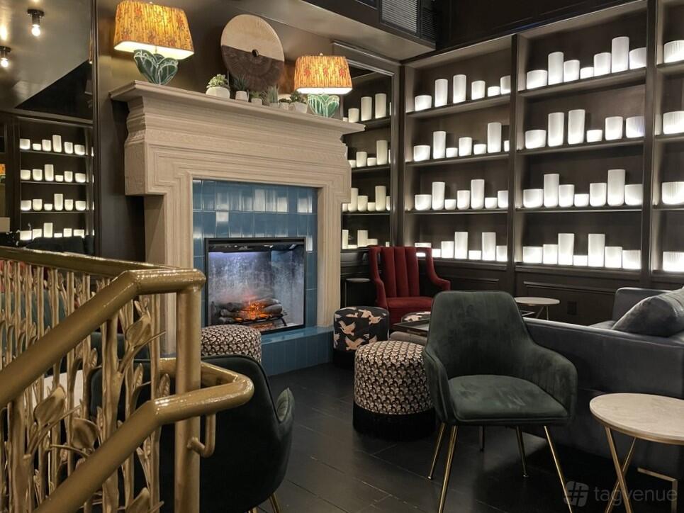 Introducing the Mezzanine, a charming and casual space designed to accommodate up to 35 guests. With its warm and elegant ambiance, this area boasts dark hardwood flooring, black wooden walls and ceilings, and a mirrors that add a touch of sophistication. Adorned with cabinets filled with captivating art pieces, all beautifully illuminated by ambient lighting, the Mezzanine creates a truly enchanting atmosphere.