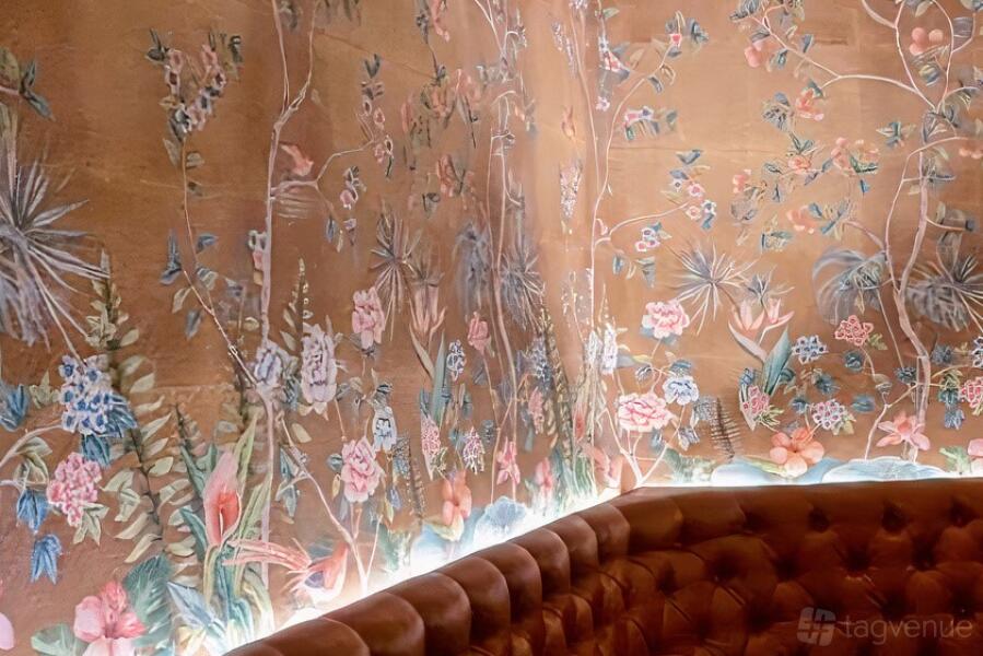 As you explore the space, you'll be greeted by lush greenery adorning gold arches and walls, adding a touch of natural beauty. Red leather wall benches, wooden tables with leather chairs, and suede chairs surrounding a stunning tiled bar provide comfortable seating options.