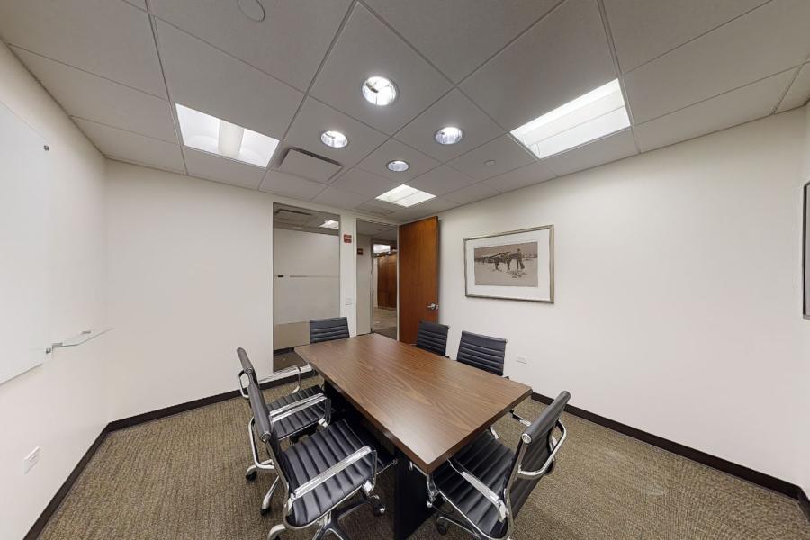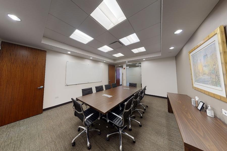 The attention to detail is evident in the elegant carpeted flooring, suspended ceiling, and the centerpiece of the room - an expansive wooden boardroom table.