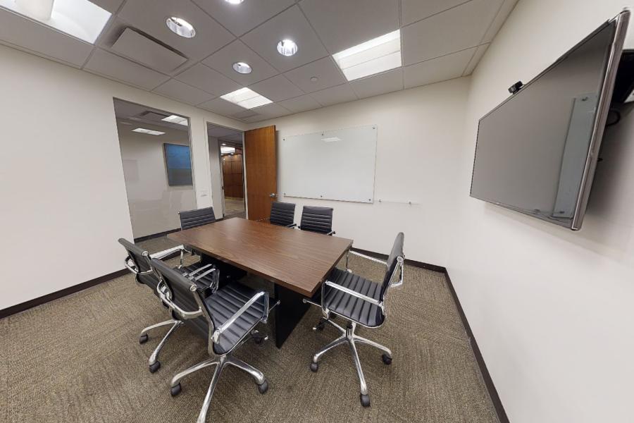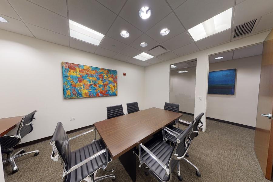 Step into sophistication with our elegant conference room, designed to impress and accommodate up to 10 individuals. This stylish setting is perfect for your next important occasion, whether it's a high-level meeting, a brainstorming session, or a professional presentation. With its tasteful combination of white and beige walls, complemented by a large whiteboard and captivating artwork, this room exudes professionalism and creativity.