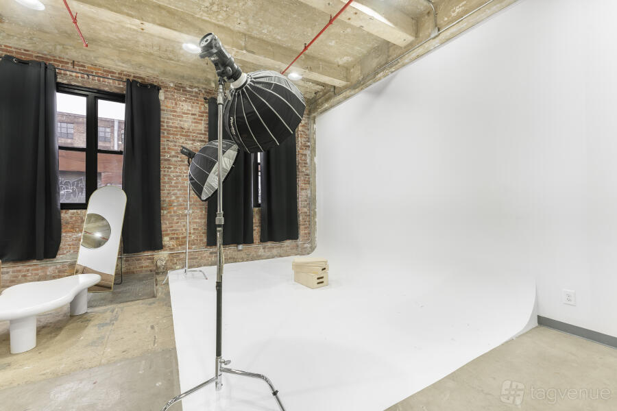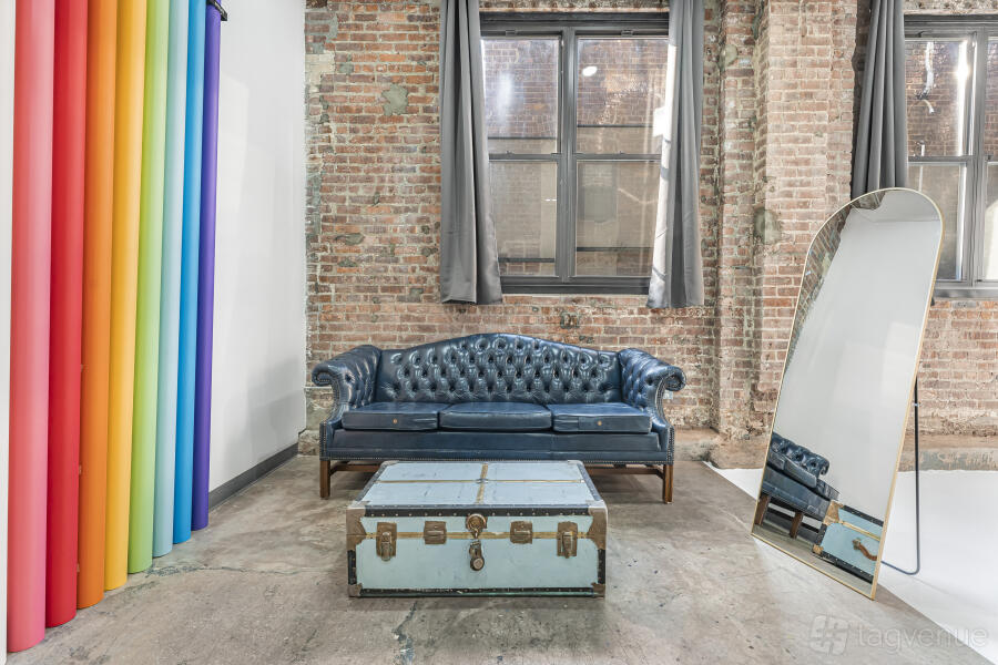 Studio 120 🗽 by 503DTLA has recently been upgraded to provide a versatile creative space. The studio features a white cyclorama (cyc) wall, south-facing windows for abundant natural light, and comes with free lighting and equipment. Conveniently located just minutes from the Grand and Montrose L Train metro stops, it also offers air conditioning and heating, a motorized paper backdrop station, Bluetooth speaker, and a textured backdrop station with all colors available at no extra cost. A comfortable living room set is included for additional flexibility.