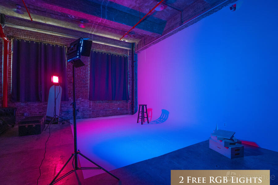 Free lighting and equipment available with your rental: Nanlite Forza FS300 LED Continuous Light, Westcott FJ400 Strobe (trigger not included), two Neewer 60W RGB LED Video Lights, Phottix softboxes (26”, 47” deep, 32” x 47”), Profoto shallow white umbrellas, 22” beauty dish, snoot, 43” reflectors (translucent, silver, gold, white, black), Neewer clamshell reflector, V-flats, C-stands, stationary stands, AV cart, sandbags, apple boxes, and a 3-step ladder.