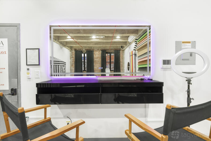 Additional amenities include a professional hair and make-up vanity, changing room, blackout curtains, mirror, clothing rack, steamer, stool, and keypad entry. The studio is three blocks from CSI Rentals in Brooklyn.