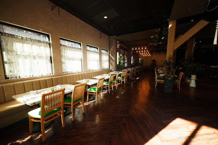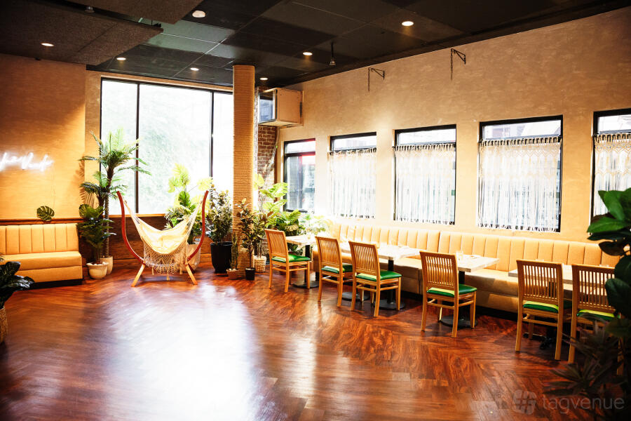 This semi-private area within Palma Verde artfully blends the vibrancy of a bustling venue with the intimacy of a secluded retreat. Architectural elements such as rustic wood paneling and modern hanging tassels delineate the space, offering privacy without isolation.