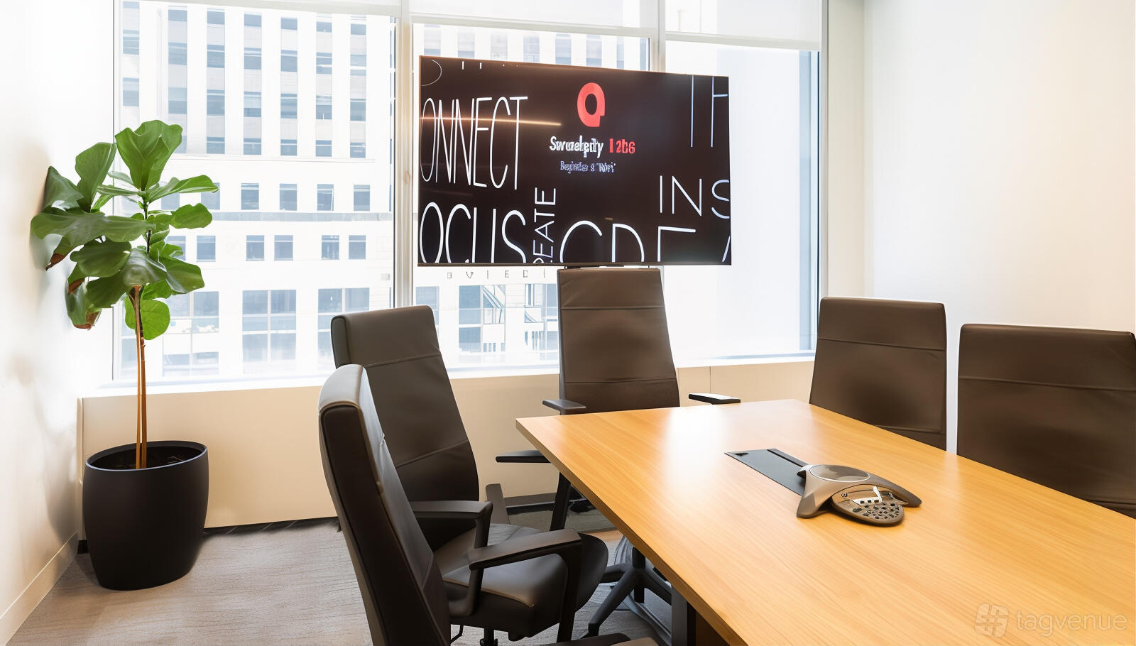 For presentations or conferences, a large screen stands ready at one end of the room. Seamless connectivity options allow integration of digital devices.