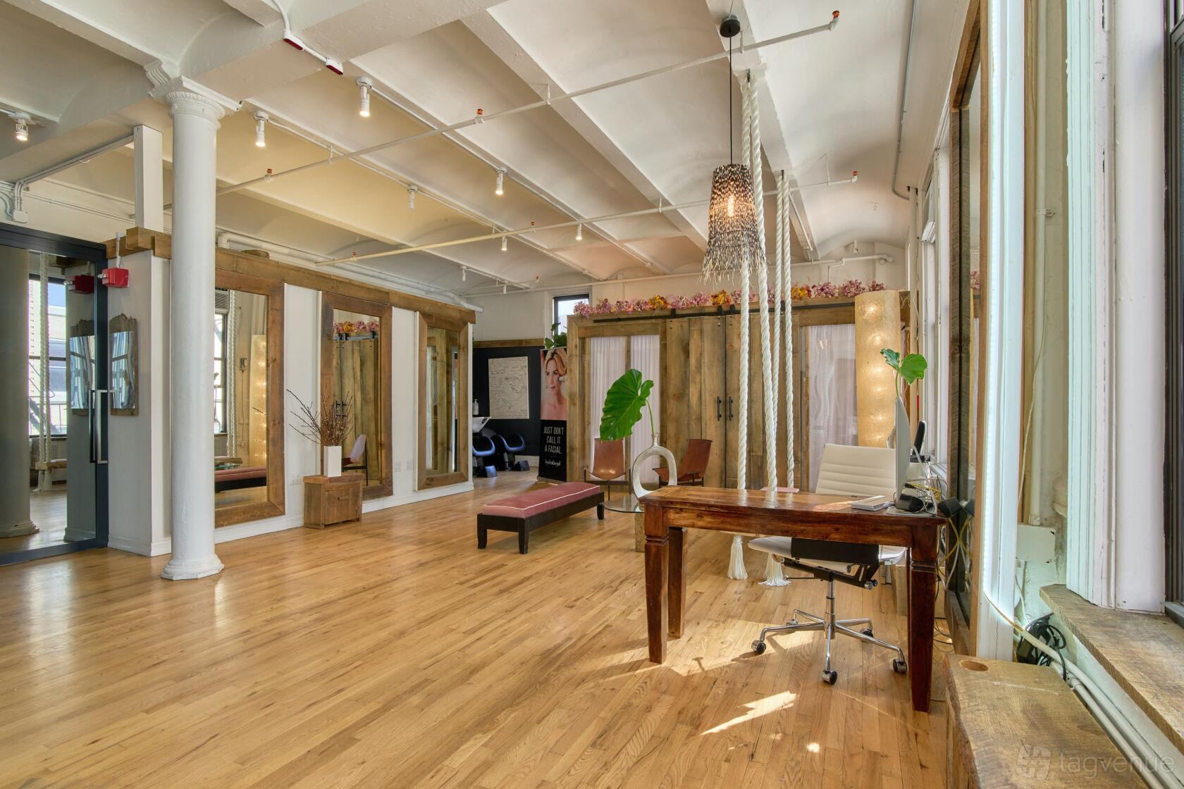 For more private gatherings, the salon also features a secluded room, a spacious coat closet, and a convenient changing area. The kitchenette, equipped with a mini fridge and microwave, is perfect for light catering or refreshments during events. The bright, airy loft ambiance, combined with clean lines and minimalist decor, provides a welcoming and adaptable backdrop for both professional and social gatherings.