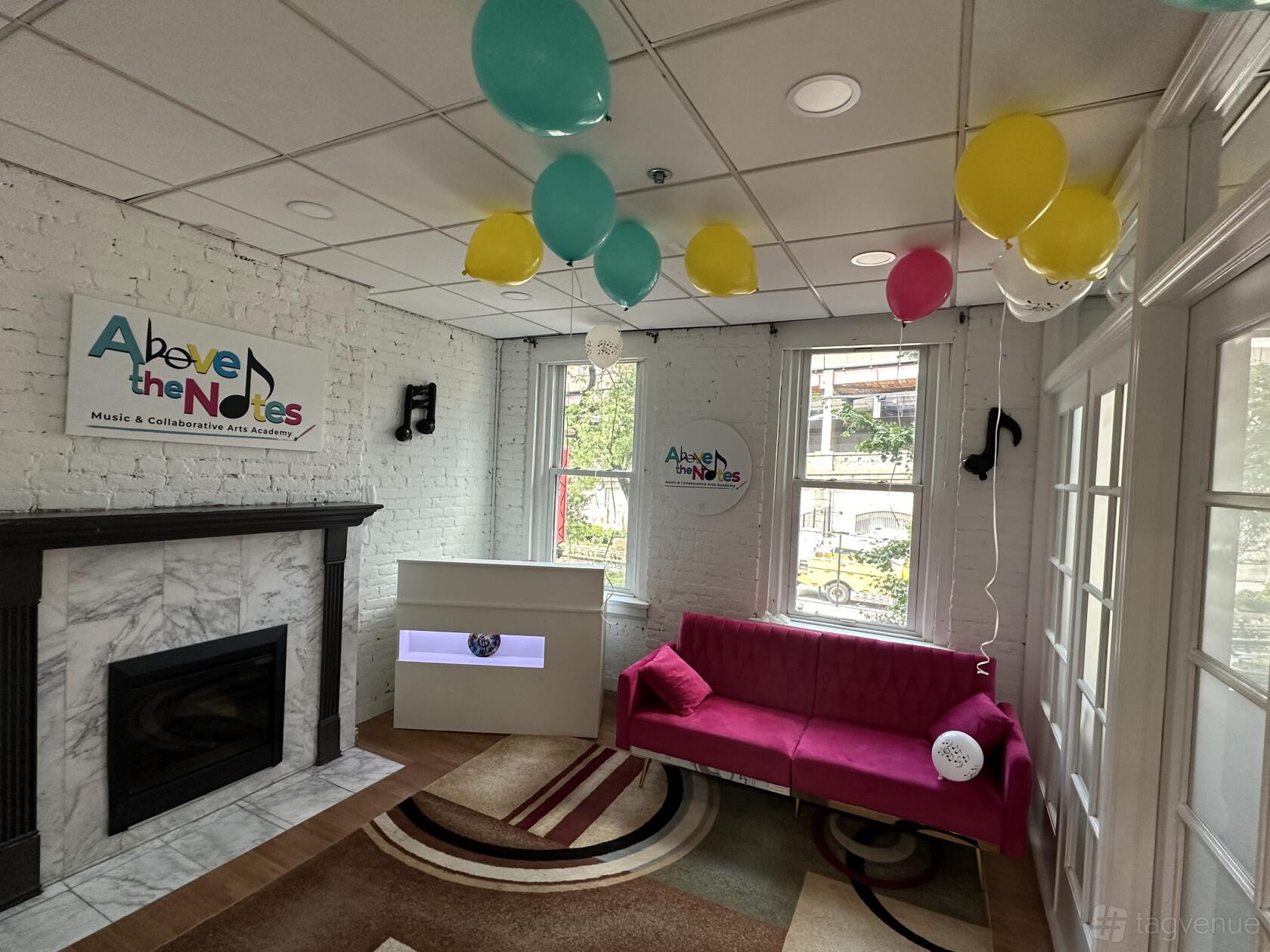 Above The Notes in New York is a great space for hosting all kinds of events. It’s 1,000 square feet, providing plenty of room for small gatherings like birthday parties, corporate events, workshops, rehearsals, or even performances. The venue has a bright and cheerful feel with lots of natural light and simple but fun decor, including musical notes and colorful posters on the walls. The wooden floors and comfortable furniture make it cozy and welcoming.