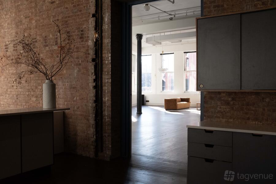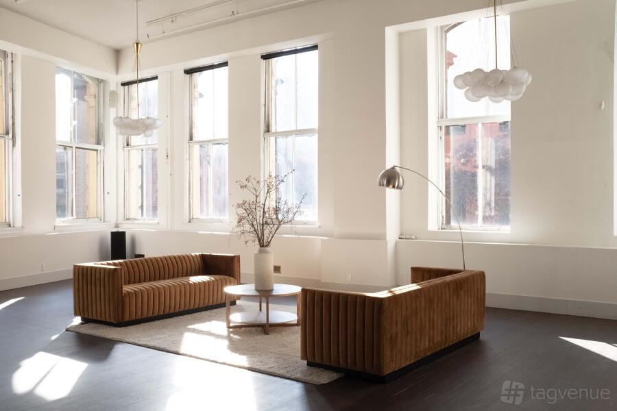 Spacious Studios 1 is a stunning loft featuring 15-foot ceilings, an exposed brick wall, exceptional natural light, and other amenities. These include a premium sound system, Wi-Fi, AV equipment, in-house furniture, a catering kitchen, and more.