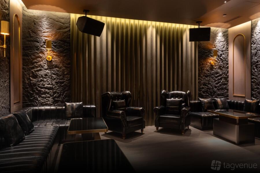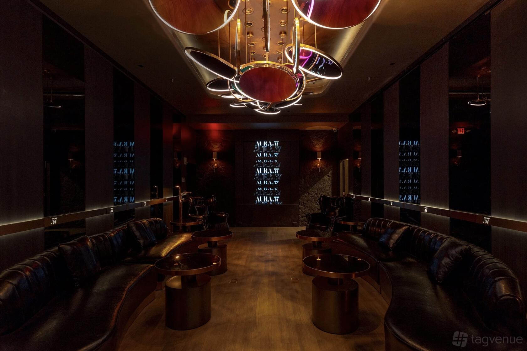 Room 1 at Aura 57 exudes sophistication with its modern design, plush leather seating, and ambient lighting that creates an intimate yet upscale atmosphere.
