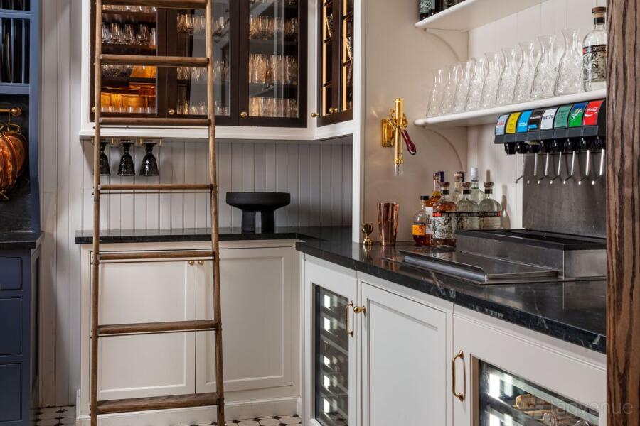 Maxwell’s Garden Room is a light, fantastic cross between an English Garden and French Versaille elegance. Our Garden kitchen, with a kitchen nook upholstered by Pierre Frey, is crowned with four beautiful Vaughan Designs chandeliers and a Cox London floral chandelier, all on top of a custom Winkelmans tile carpet and a Gracie Chinoiserie frieze.