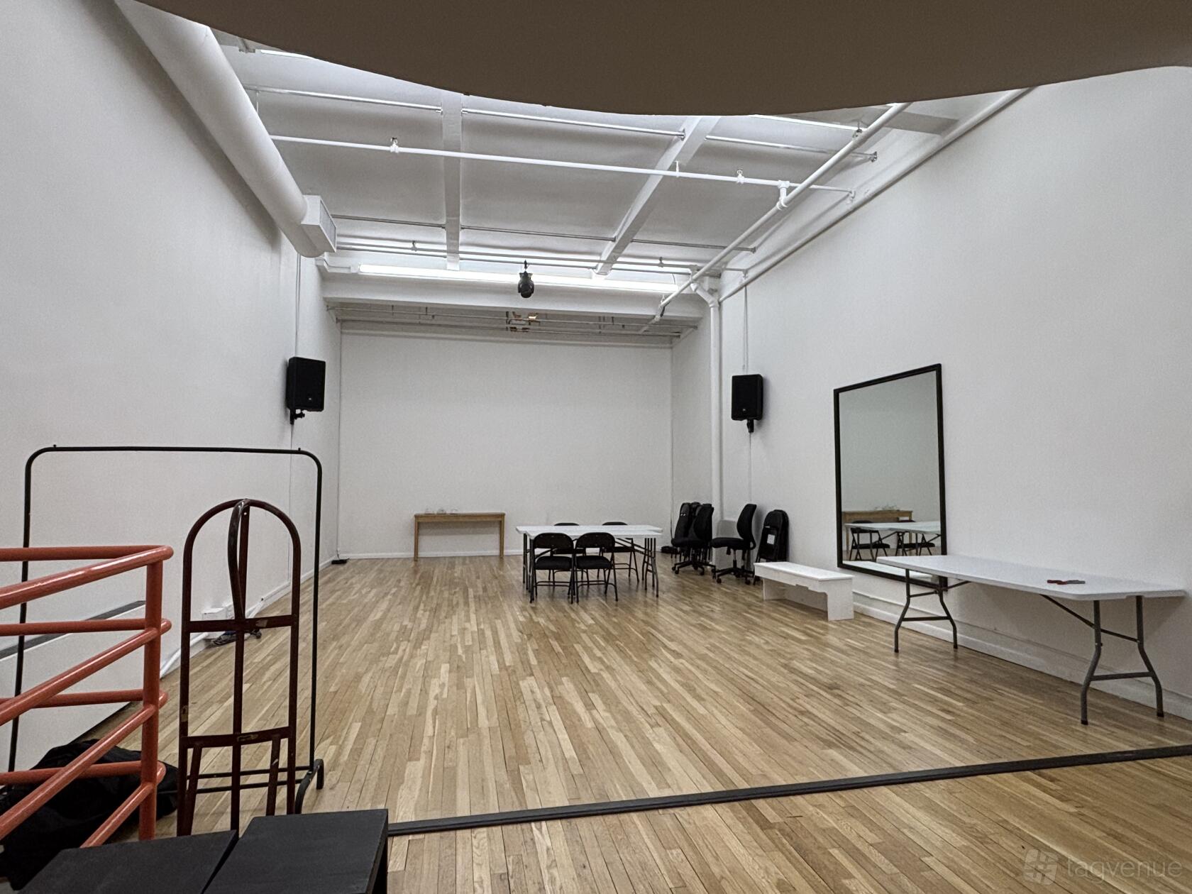 The American Mime Theatre Studio in Midtown Manhattan’s Chelsea neighborhood is a versatile, fully equipped space designed for creative use. It features 16-foot ceilings, hardwood floors, a comfortable reception area, a private dressing room with bathroom, and a complete lighting, sound, and projection system for performances. Well-suited for theatre or dance rehearsals, classes, and workshops, the studio is available to rent for both single sessions and recurring events.