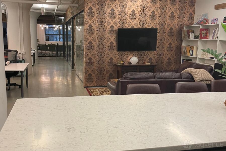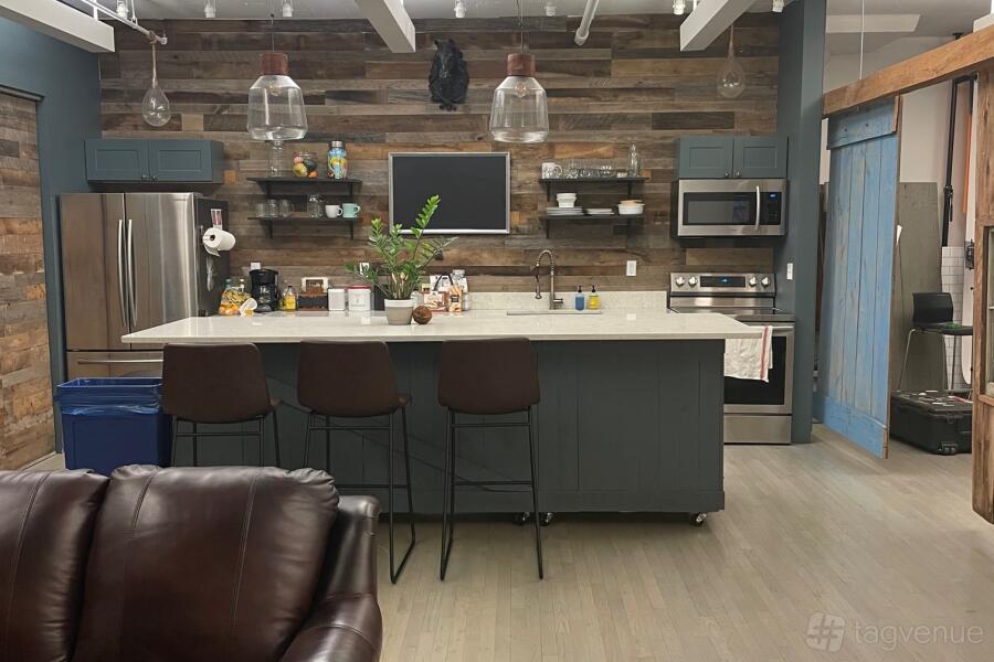 The space features fully furnished offices and a full kitchen that can be used to create many scenes. Equipment is available for film and photo shoots upon request. We have both a standard elevator to bring you to the studio as well as a freight elevator with a side loading dock to help unload any equipment or large items you might need for your production. Parking is available on the street, some spots are free, some are metered. There are also commercial public parking garages within a three-block radius.