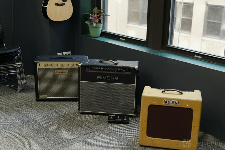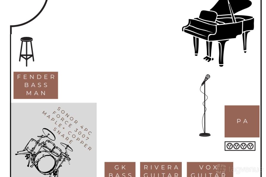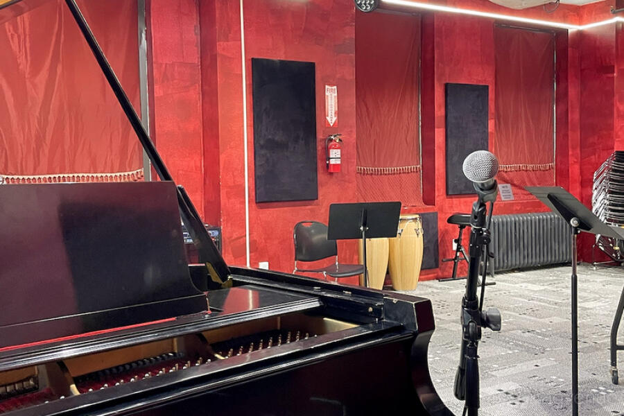 The studio's 15 unique rehearsal rooms are spread across two floors. The Cathedral Studio is carpeted on the stage and has hardwood floors, sound, and lighting to professional standards: wash lights, used during a show as an ever-present aura; a projector for screens; and a mixing board-a magic box to blend different sound inputs-A & H. It is an ideal setup for performances, showcases, or private events.