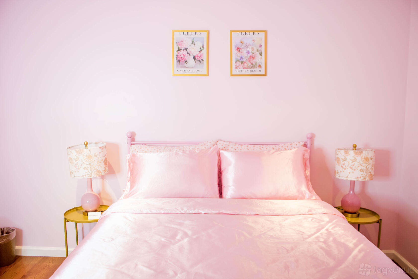 The ‘Guest Bedroom’ of the property is decorated with hints of florals in a sea of light pink. Currently, this room is outfitted with a plush queen size bed with pink satin and floral bedding. Beside the bed are matching goldenrod end tables with blush floral lamps. Across the bed is a 6-foot wide closet with accordion doors and lighting for storage. Even though this room may look like a 'bedroom' it's capable of much more. Like every room in this apartment, the room is versatile and fully transformation for whatever your needs of your client’s needs may be.