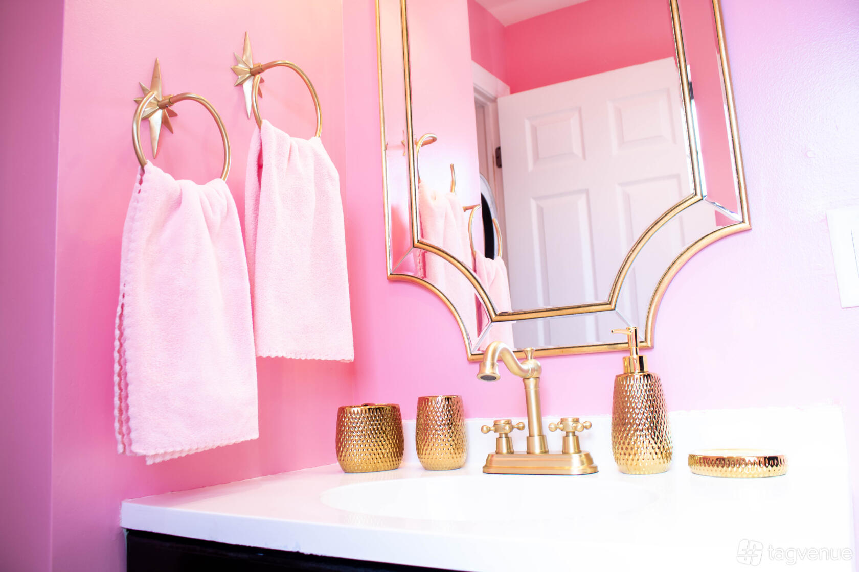 The Pink Speakeasy is a unique rental location that features an all-pink dollhouse meets vintage deco style all fitted in a three-bedroom, two-bathroom second story apartment located in West New York, New Jersey (20-30 mins from Times Square NYC). Even though the space has a particular setup, it is completely transformable to whatever your vision is.