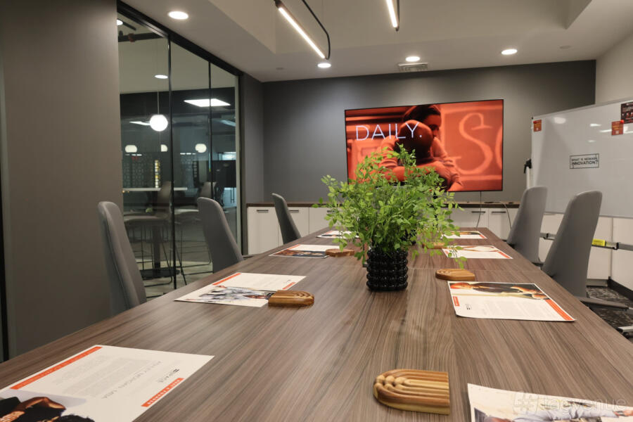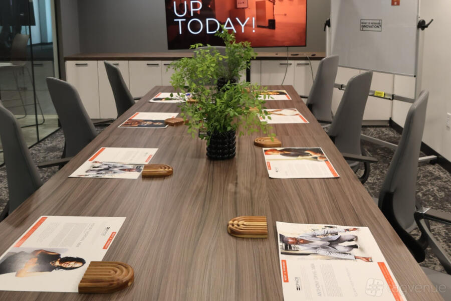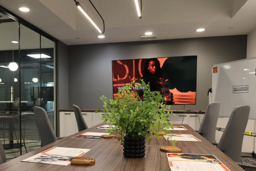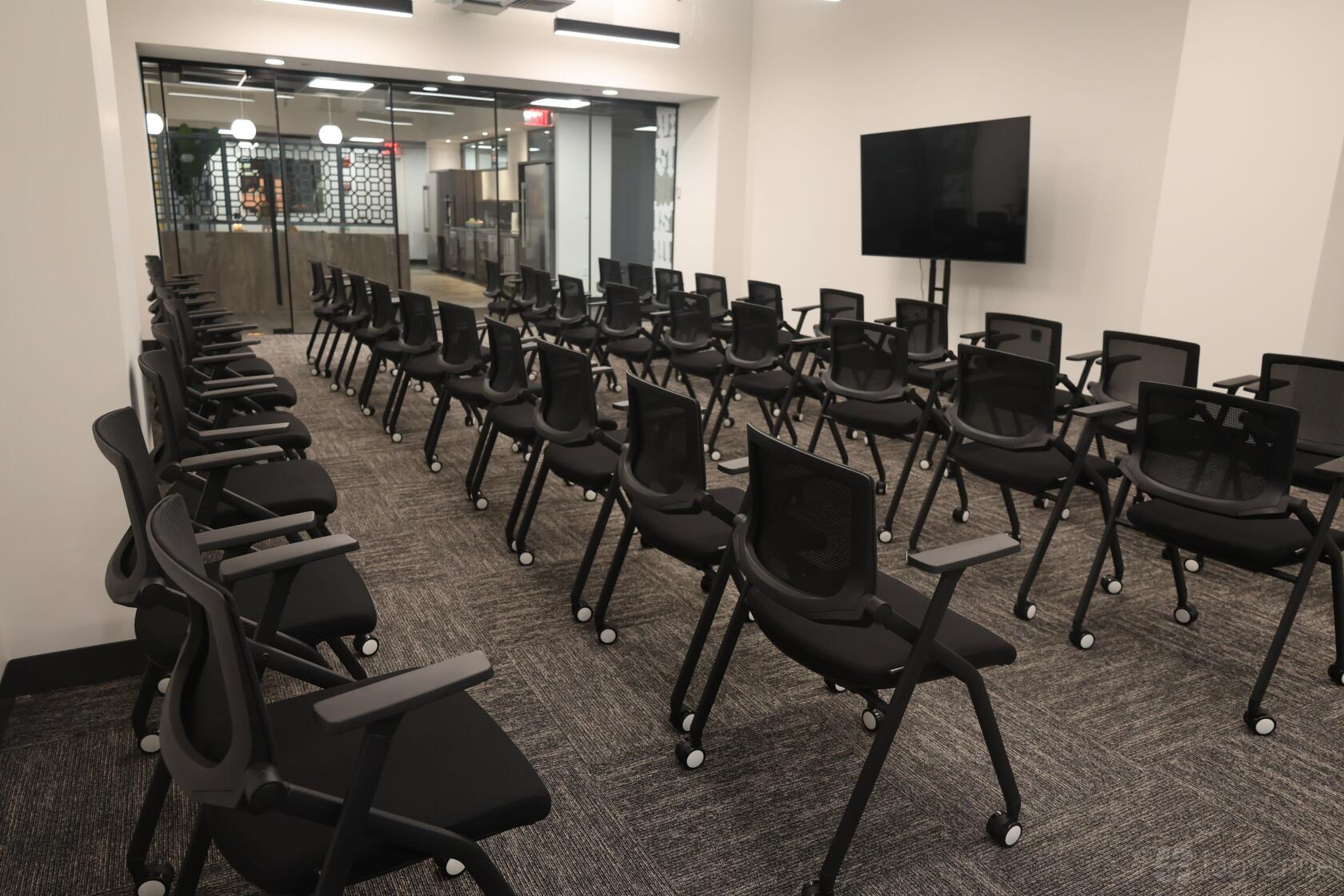 This space can accommodate up to 50 guests. It is equipped with chairs, tables, and a large TV. It is a good fit for hosting workshops, presentations or seminars.
