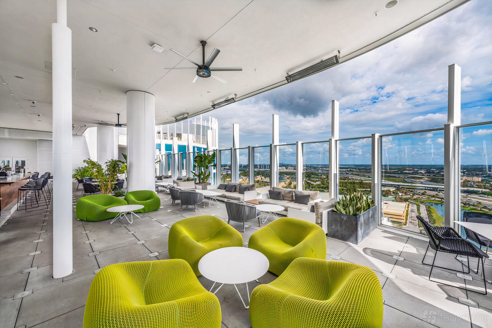 The space is a lounge-style area. It includes tall glass panels for safety without blocking views. Areas for bar service and custom décor are also available. You're welcome to bring in your own catering.