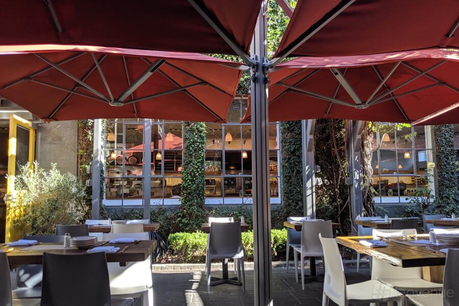 The patio in its entirety is approximately 1,000 square feet, with full patio seating for up to 70 guests or standing room for 90. Perfect for larger gatherings, whether it is a casual company outing, birthday celebration, or lively reception, this open-air space makes for an exceptional setting.