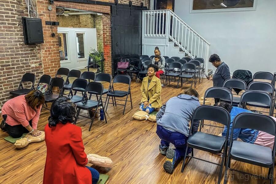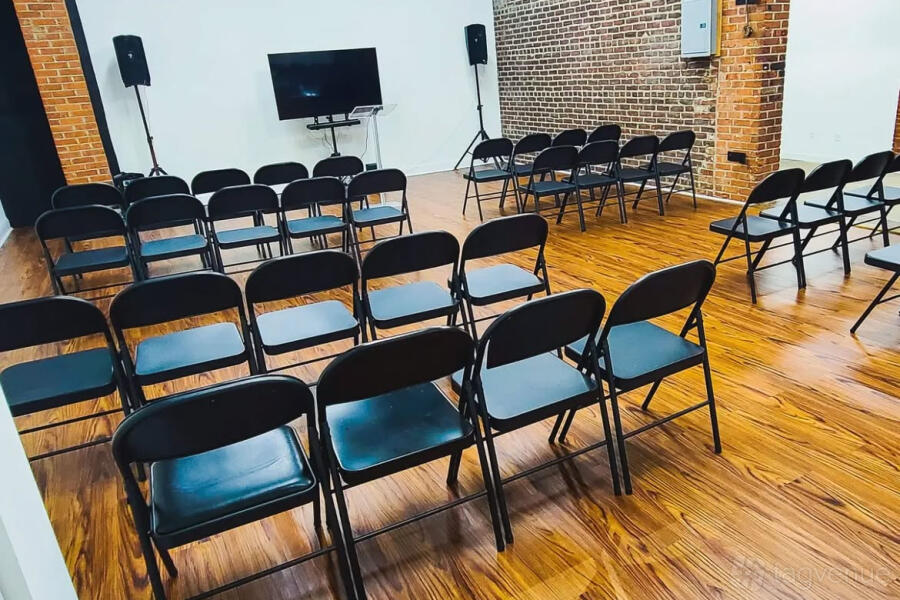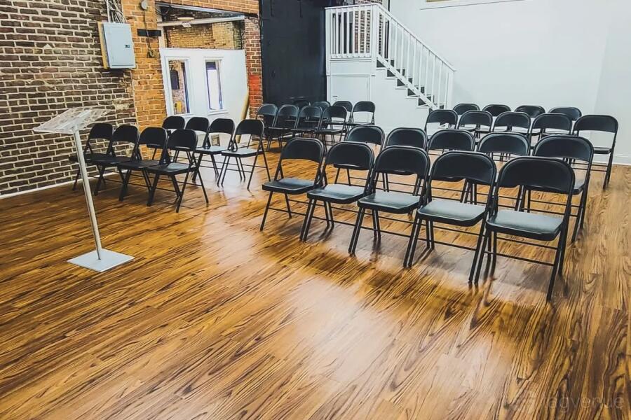 The room has high ceilings and carpet floors. This room is equipped with full audio, visual, and professional lighting. Folding chairs and tables and tables are included with the space booking to be set up according to your needs. There is a small prep area includes a sink and counter space. There is no stove on the premises.