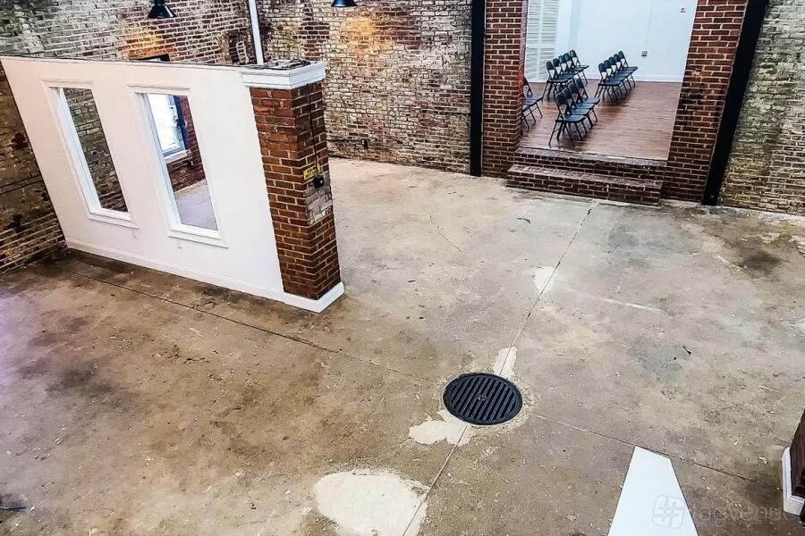 The layout is open, so you can clear the floor or set up for classes, pop-ups, or small events. Lighting runs across the ceiling with exposed pipes above.