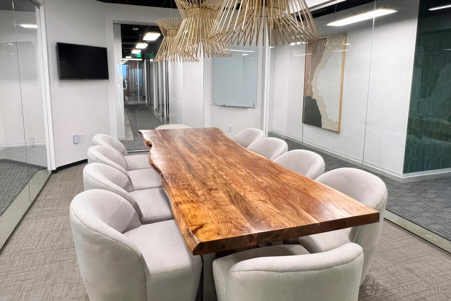Welcome to The Eastman Conference Room, a modern and sophisticated space designed to enhance your meetings and presentations. This room features a large, sleek wooden table surrounded by comfortable, high-backed chairs, creating a professional and inviting atmosphere.