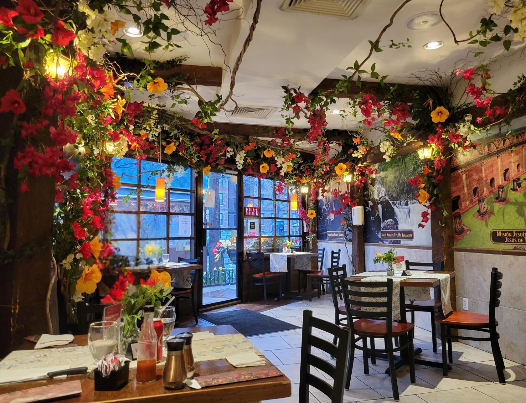 Our restaurant mixes homey comfort with a colorful touch. It has floral decorations, small tables, and wall art inspired by Paraguay. It’s a great fit for small gatherings, casual events, or food-focused meetups.