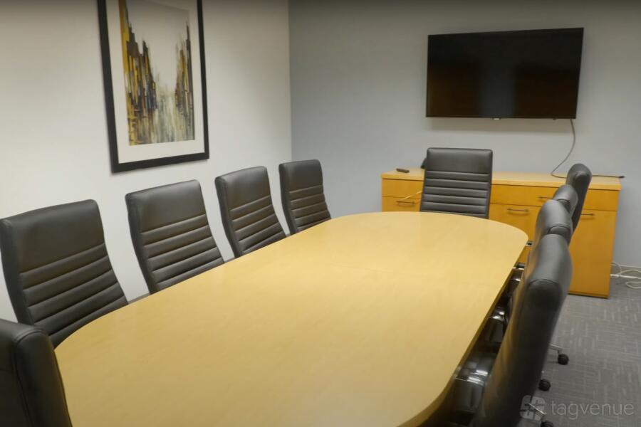 The room has a clean, minimalist design with a neutral color palette, wall art, and overhead lighting, creating a professional and comfortable atmosphere for small gatherings.