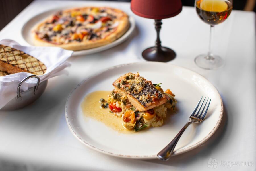 Our kitchen uses fresh sustainable ingredients and specializes in California Coastal Italian Cuisine with handmade pizzas, pasta, steaks, and seafood. Our Mezzanine accommodates up to 100 guests and we offer a private bar and TVs upon request for private events and meeting spaces.