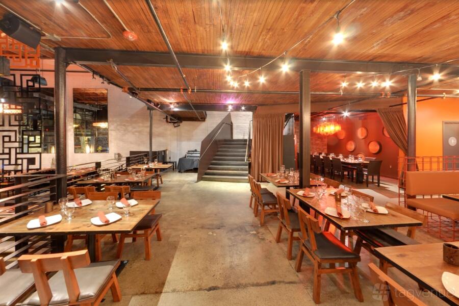 Step into Elevated Space, a semi-private haven designed to accommodate up to 42 people in utmost comfort. With a combination of classic tables and generously sized booths, this space offers a versatile seating arrangement that caters to your needs. The ambiance is a perfect blend of modern and rustic, featuring concrete flooring, walls adorned in striking black and orange hues, and a wooden ceiling accentuated by sleek black steel beams.