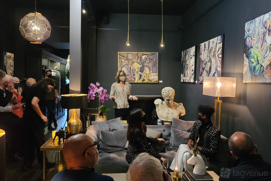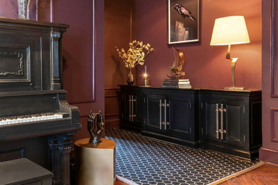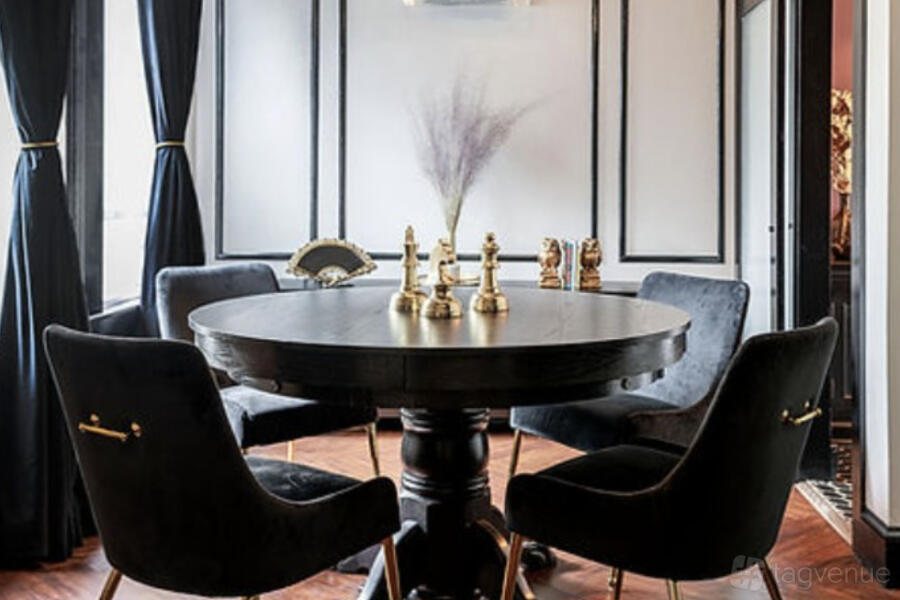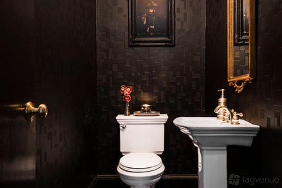 Our gorgeous 1,200 sqft main floor has 3 distinct rooms plus a service kitchen, a custom blackjack table, hardwood floors, rotating artwork by distinguished local artists, multiple seating areas, designer furniture, 12-foot ceilings, A/V system and sound, and access to an outdoor patio/yard plus basement speakeasy (additional cost, inquire with host for availability).