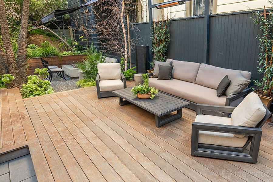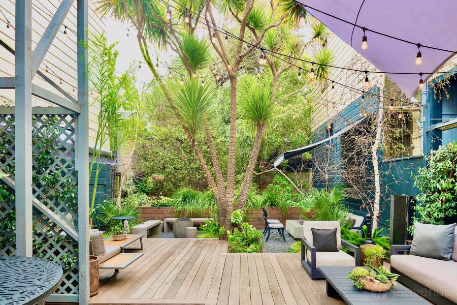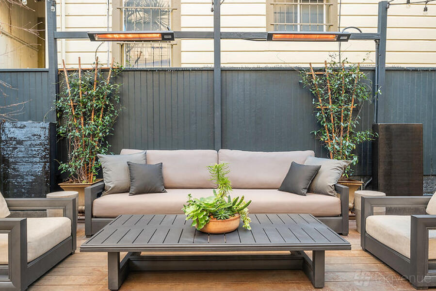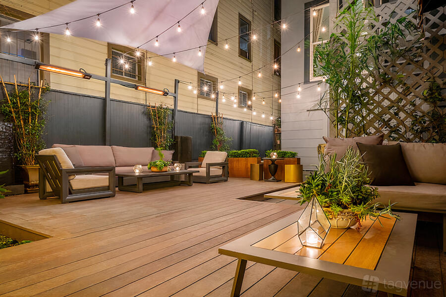 This newly-renovated, private outdoor oasis features a gorgeous Brazilian Ipe deck, two fire pits, overhead electric heaters, warm outdoor cafe lighting, speakers for background music, and plenty of space for your group to enjoy a beautiful San Francisco evening.