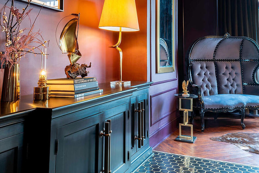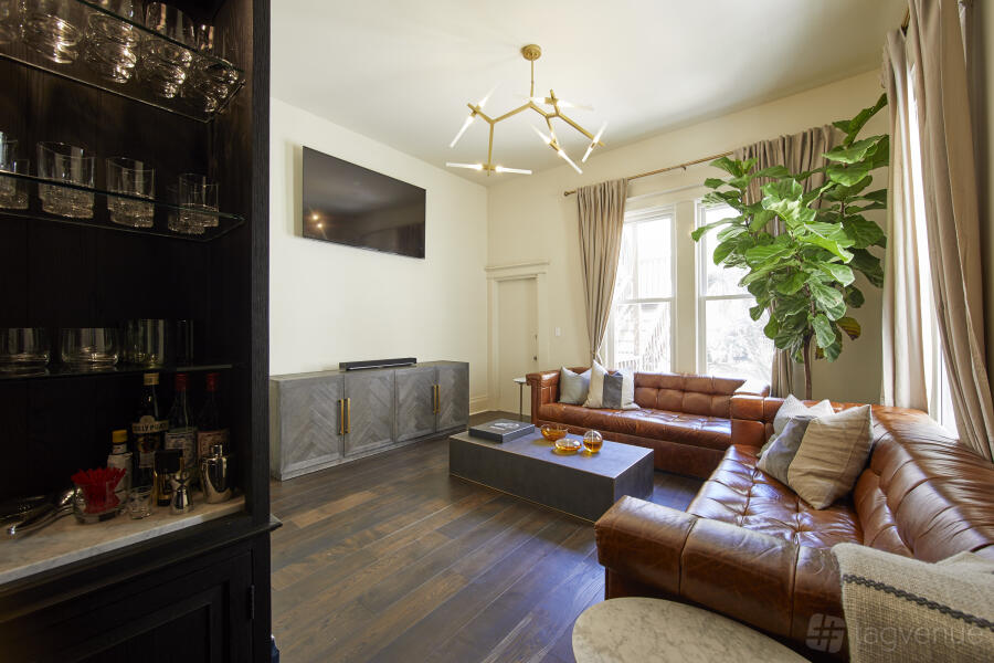 Our gorgeous 1,200 sqft main floor has 3 distinct rooms plus a service kitchen, a custom blackjack table, hardwood floors, rotating artwork by distinguished local artists, multiple seating areas, designer furniture, 12-foot ceilings, A/V system and sound, and access to an outdoor patio/yard plus basement speakeasy (additional cost, inquire with host for availability).