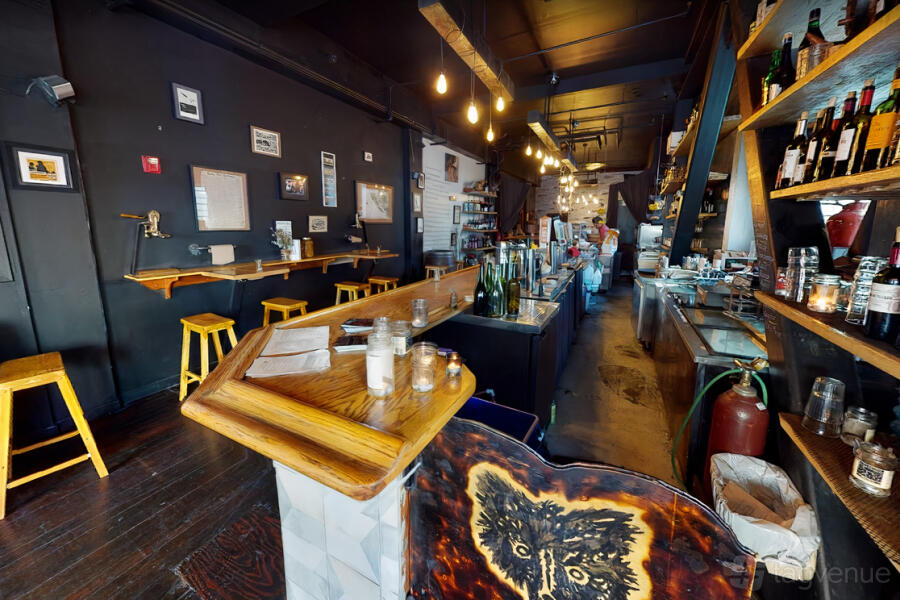 The front section of our indoor space is ideal for groups of 15 to 20 people, and can be reserved with no booking fee at any time of day with enough notice. It consists of three large hightop tables, two smaller barrel tables, and a few seats at the bar.