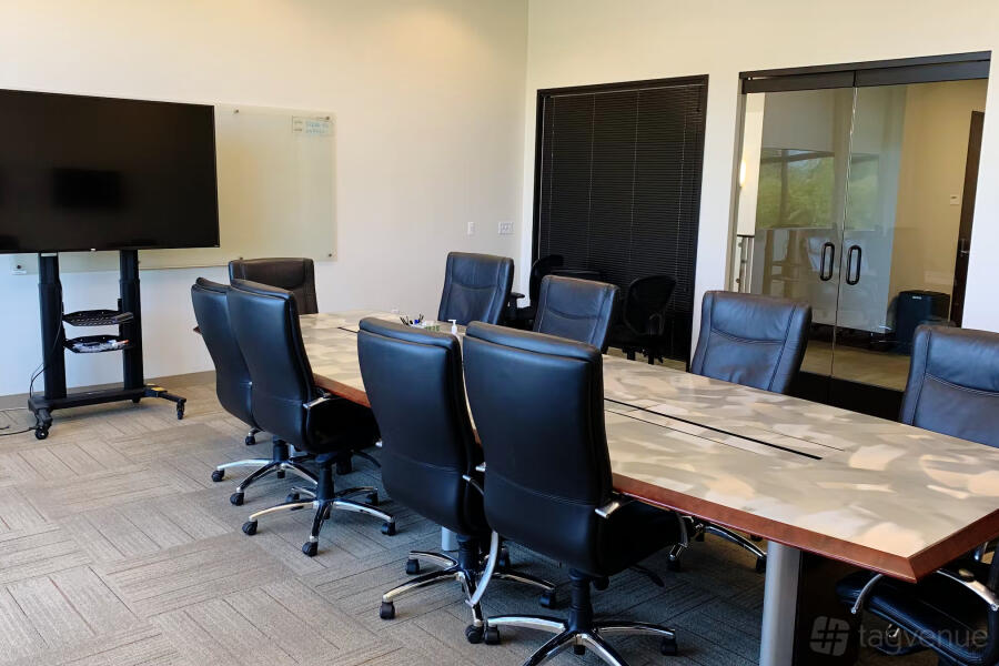 It includes comfortable office chairs, a table, and a TV for displaying presentations. There's also a spacious window to let in natural light, with blinds for covering.