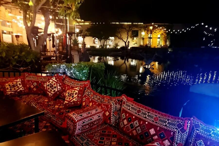 The space consists of an indoor area and a beautiful patio over the water. You can use umbrellas, or a decorative tent. The outside part is full of plants and is a great place to relax. Inside, a bar awaits you.
