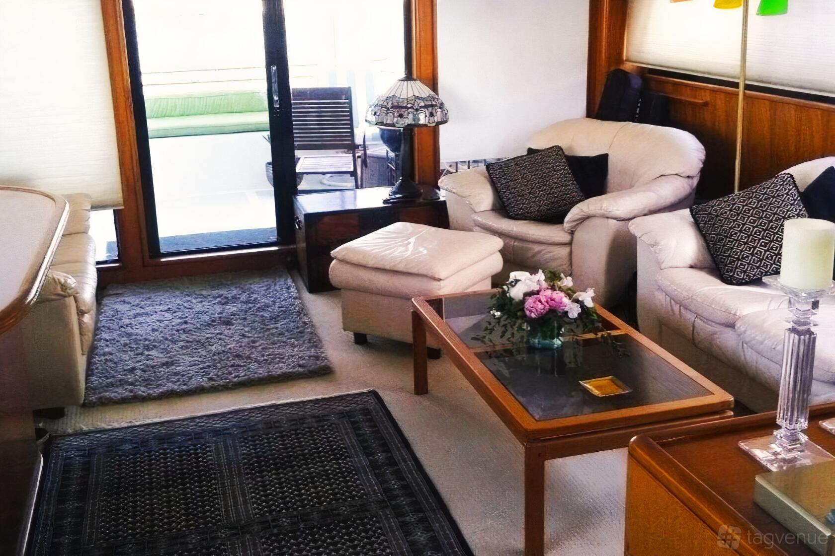 Relax in the main salon, which features an elegant couch, a comfortable armchair, and an antique Japanese trunk called 'chodonsu. Enjoy a full-size bar and widescreen TV for entertainment. The open sun porch, complete with chairs and a table, is the perfect spot to relax and enjoy a glass of wine and some delicious hors d'oeuvres.