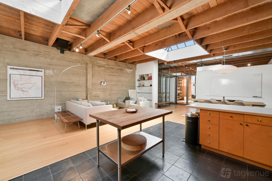 Creative 2-story loft with exposed timber, sandblasted concrete walls, floor to ceiling glass, soaring ceilings, lantern skylights, designer furniture and postmodern cabinetry in SoMa. Blocks from Caltrain and headquarters of technology companies like Airbnb, Adobe, Dropbox, Lyft, etc.