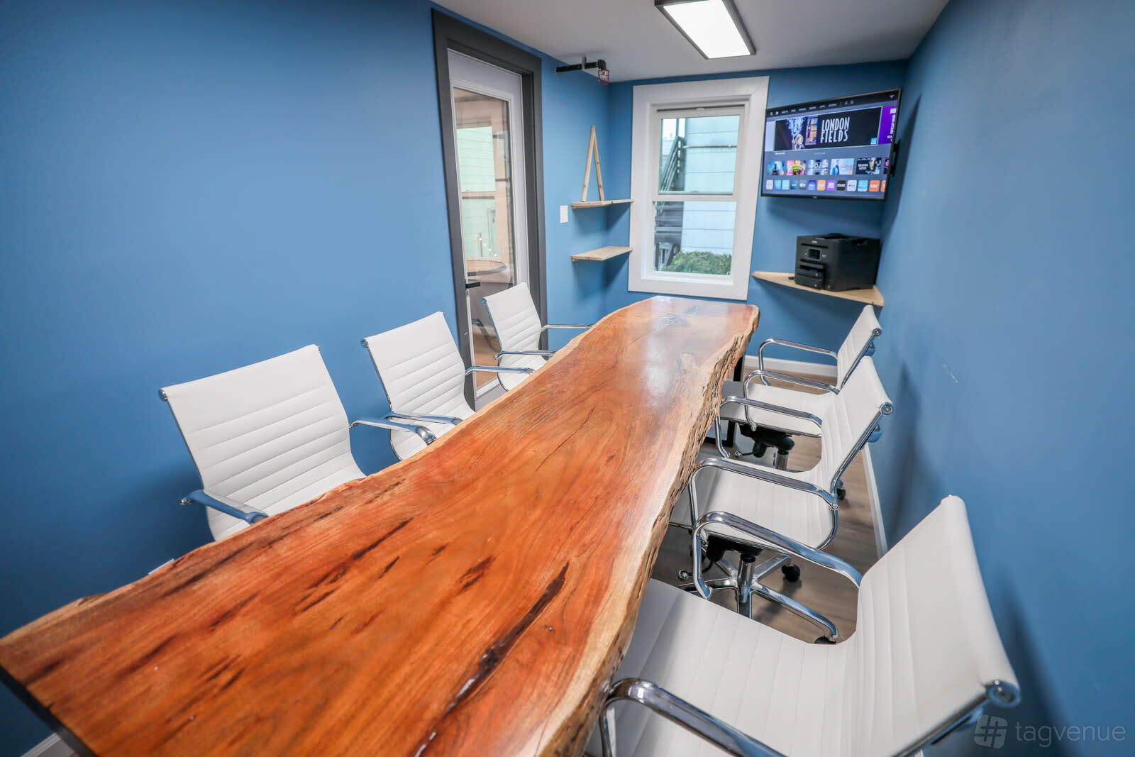 The Boardroom has a lively energy with its blue walls that inspire focus. In the center is a long wooden table contrasts nicely with the modern design.
