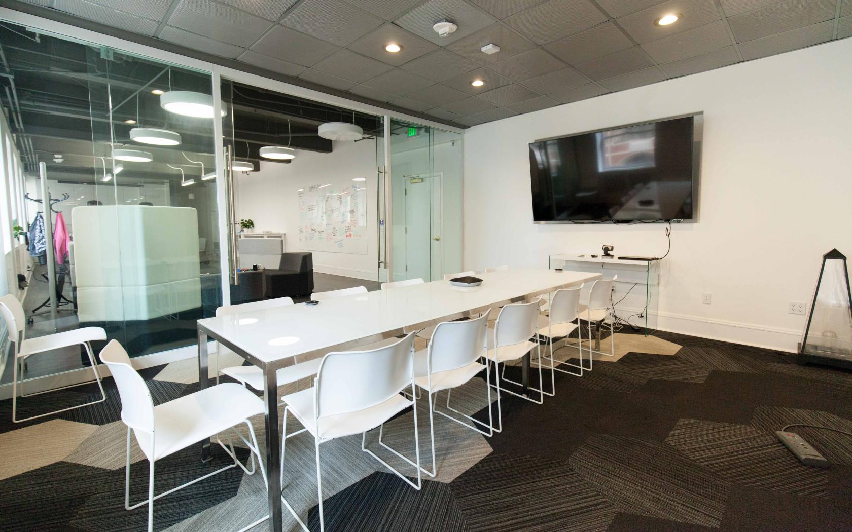 Modern, beautifully renovated office space with private offices, open plan space, collaborative seating, open kitchen, conference room, white boards, 80" TV for conference calls and presentations.