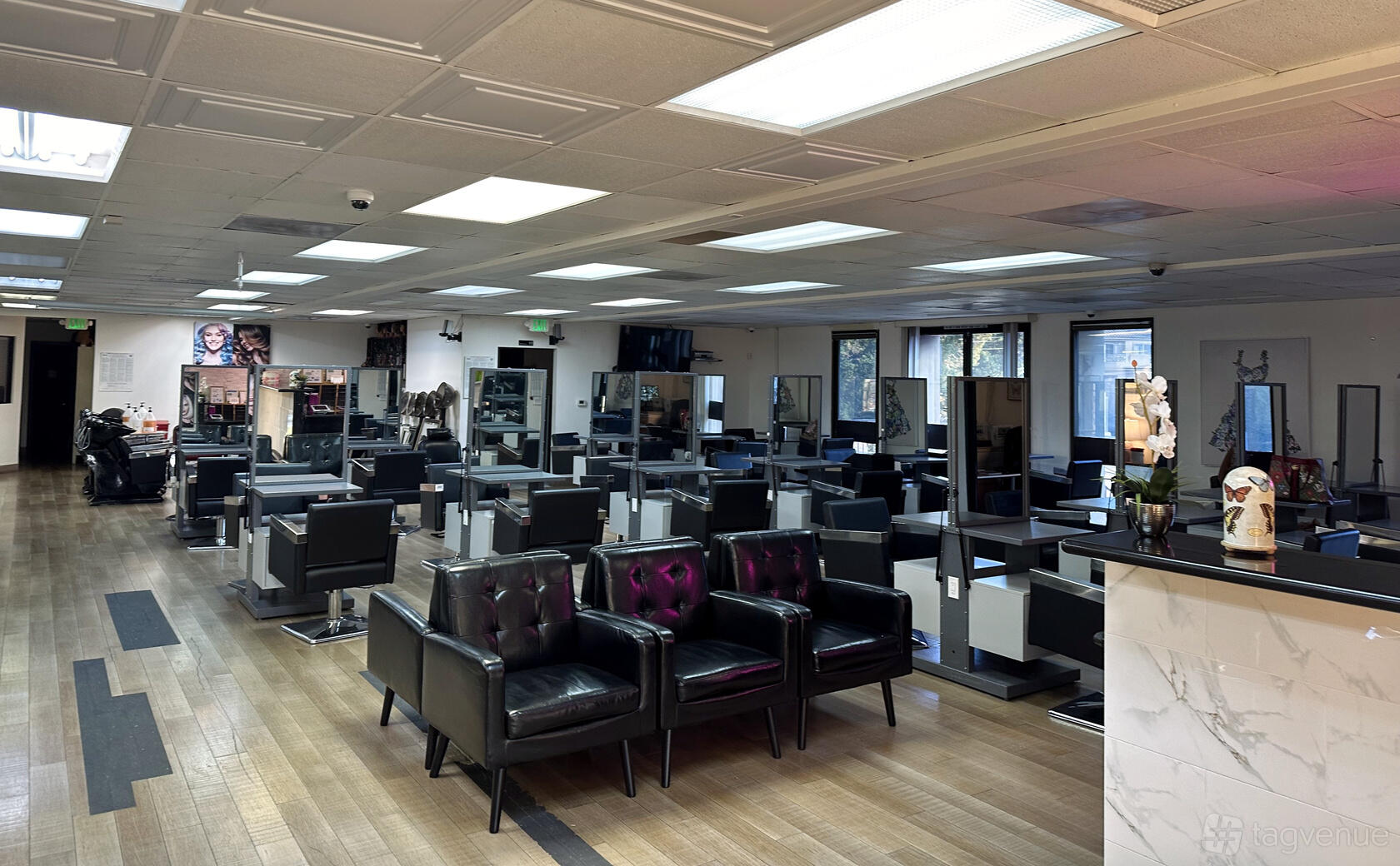 Flair Beauty College, located on Valencia Blvd, offers a versatile beauty school and salon with a main area, small classroom, esthetician room, and prep space. Spanning about 4,500 sqft, it can accommodate up to 150 people. The fully equipped parking lot fits over 50 cars or production trucks and vans, making it ideal for filming.