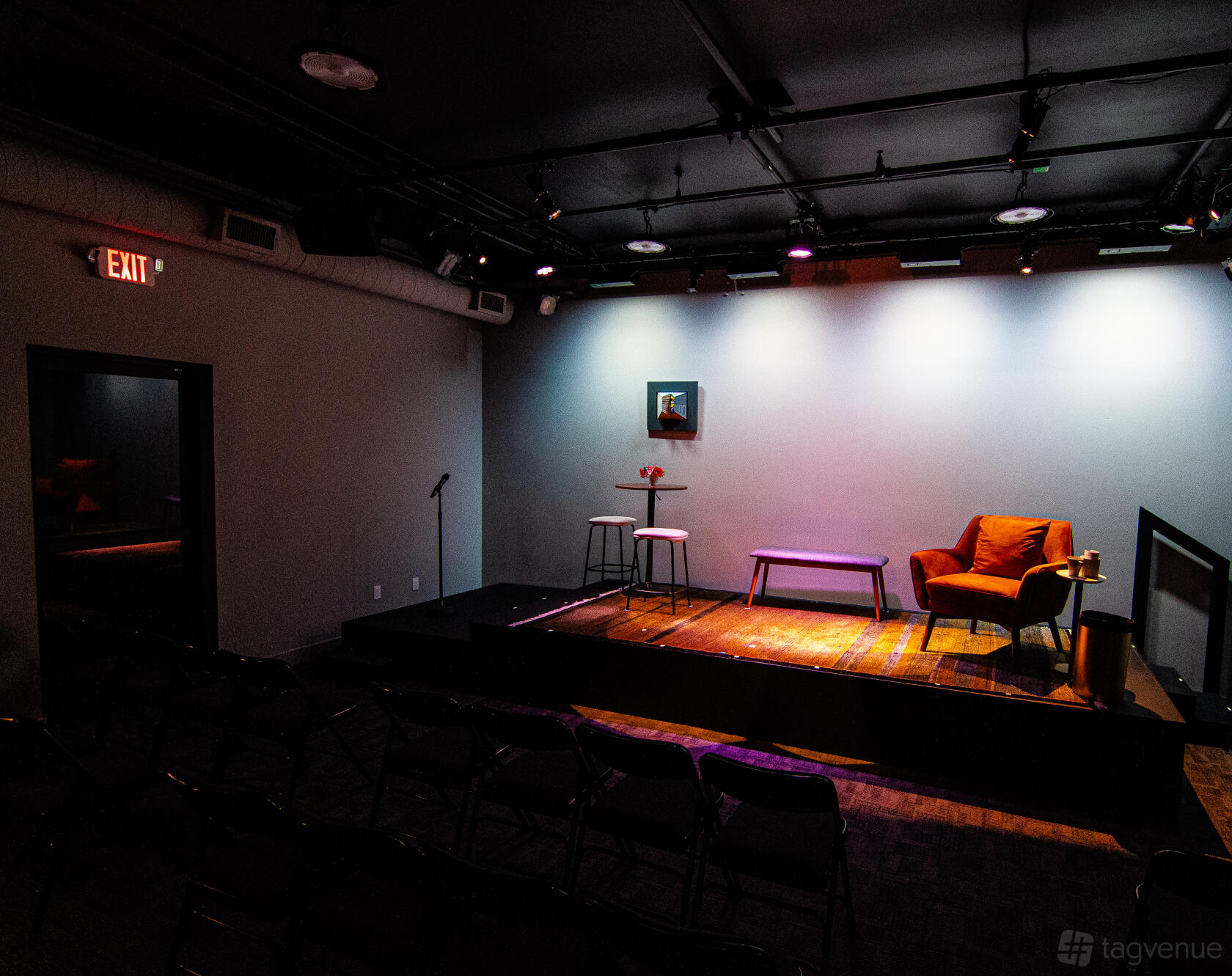 Our venue is a modern theater space in Santa Monica. We offer three distinct areas: a multipurpose room, a main performance space with stage and professional-grade tech, and the full venue. The entire venue includes the lobby/art gallery, green room with kitchen, and accessible restrooms.