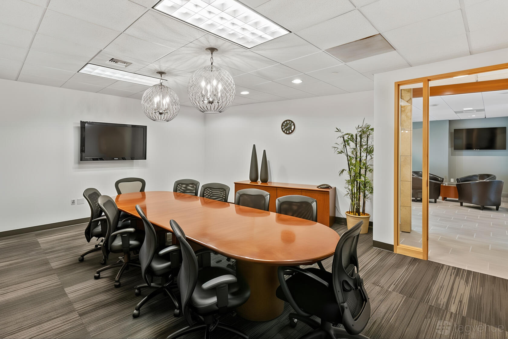 Equipped with a flat-screen TV, a wooden credenza adorned with vases and a telephone, and a potted plant, the room combines functionality and style. It's a perfect setting for valuable meetings and conferences.
