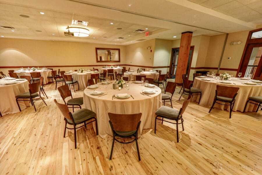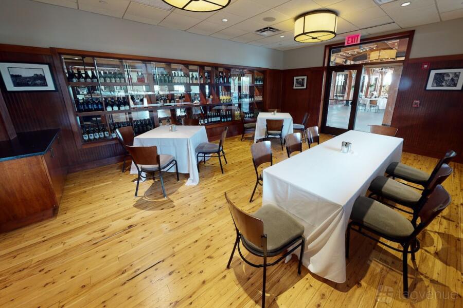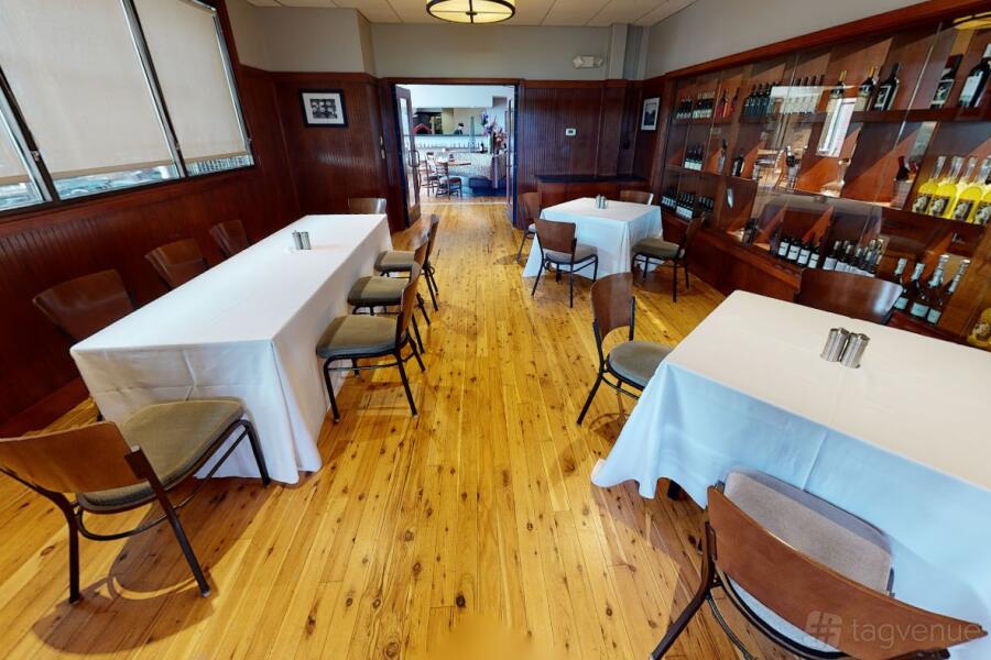 The Regusci space offers a warm and inviting atmosphere with a hint of rustic charm, ideal for intimate gatherings or private meetings. The room is distinguished by its natural wooden floors and traditional wooden chairs that complement the white-clothed tables, creating a cozy, welcoming environment.