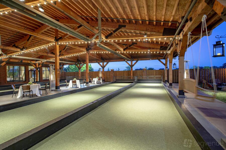 The decor blends modern chic with rustic elements, highlighted by warm lighting and comfortable seating that creates an inviting environment for both social and corporate gatherings. With dedicated areas for bowling and bocce, along with advanced equipment and amenities, Pinstripes ensures a memorable experience for all ages.